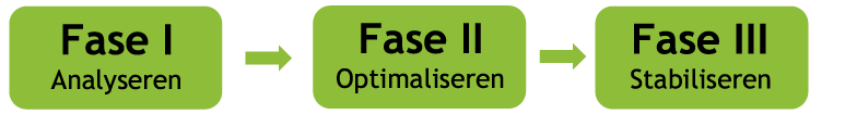 Als de analyse is afgerond, ontwikkelen wij een maatwerkadvies. Daarin staat hoe we samen de optimalisatieslag kunnen maken, dus wat u zelf kunt doen en wat wij voor u kunnen betekenen. Tenslotte moeten de stappen die gemaakt zijn ook geborgd worden, zodat u er zeker van bent dat u ook op de langere termijn zelf bepaalt hoe uw mobiliteitsbeleid eruit ziet. Dit noemen wij de stabilisatiefase. In onderstaande afbeelding worden de fases schematisch weergegeven.